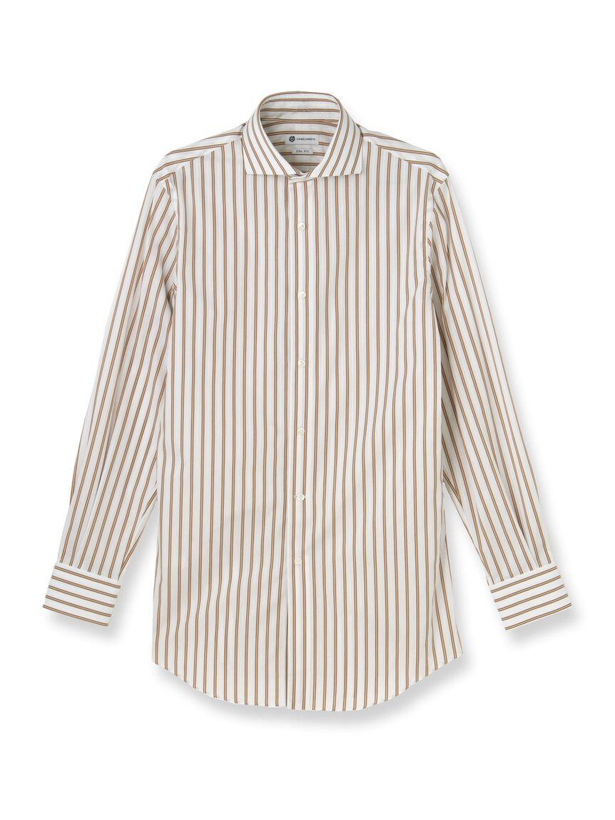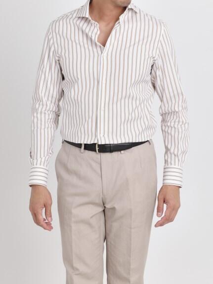 秋らしい温かみと、上品な柔らかさを持つベージュ。落ち着いたベージュのストライプは、大人の余裕と優しさを感じさせます。ネクタイを締めればエレガントに、ノータイで着こなせば柔らかな休日スタイルに馴染みます。