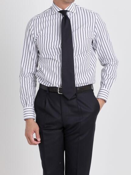 クラシックで知的な印象を与えるネイビー。オフホワイトのベースに濃いネイビーのストライプがシャープなコントラストを生み出し、信頼感と洗練された佇まいを演出します。ビジネスシーンはもちろん、クールなジャケパンスタイルにも最適です。