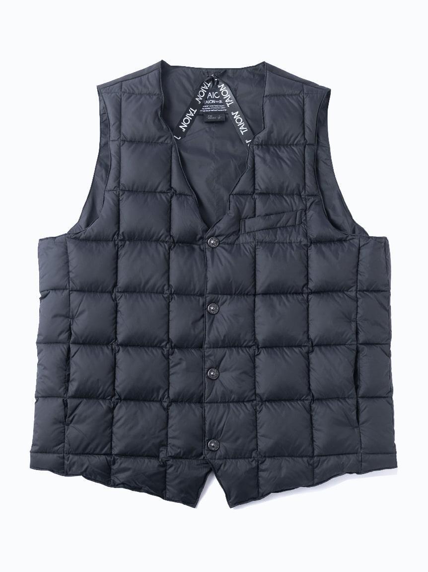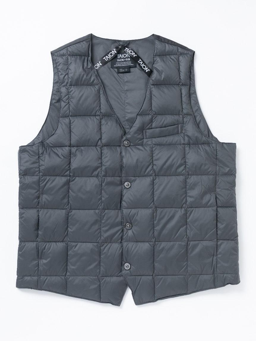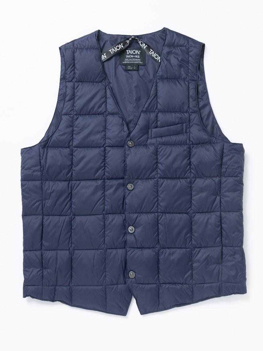 このTAIONダウンベストがビジネスシーンで支持される最大の理由は、背中のダウンを意図的に抜き、背中周りがすっきりとフラットになる点です。