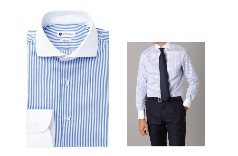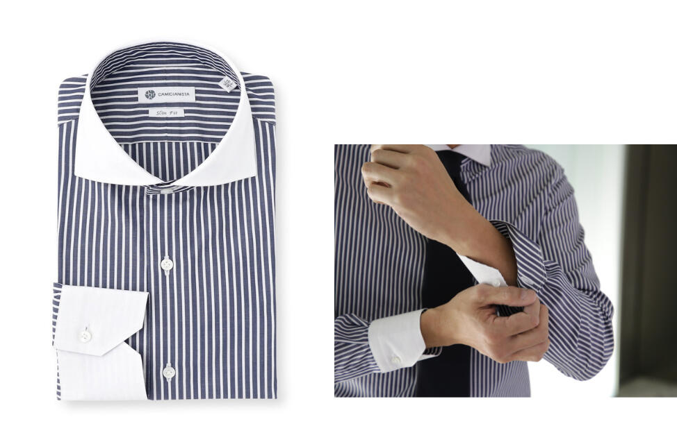ストライプとホワイトのコントラストが美しく、ネクタイスタイルからビジネスカジュアルまで、あなたの装いを格上げします。