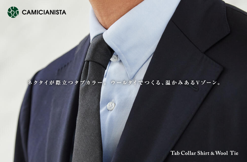 ネクタイが際立つタブカラー。ウールタイでつくる、温かみあるVゾーン